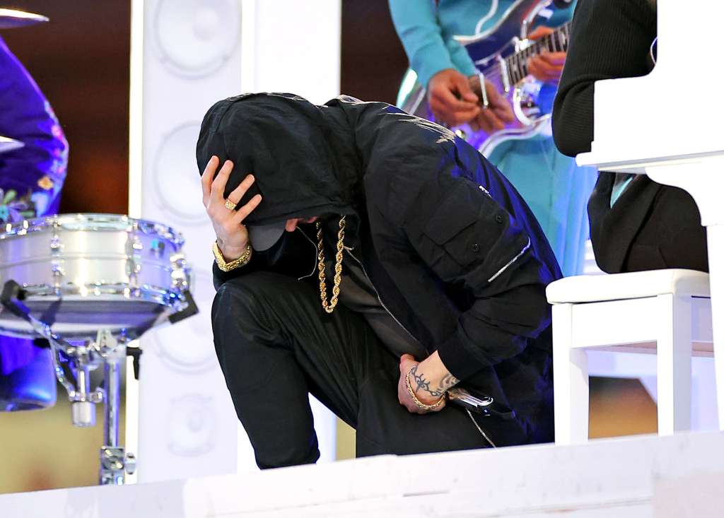 The kneeling took place after the rapper performed his 2002 hit “Lose Yourself.” The kneeling gesture became a subject of controversy when former NFL quarterback Colin Kaepernick used it as an act of protest against police brutality and racial discrimination.