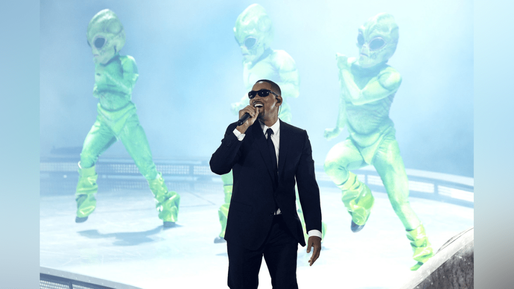 Smith, who starred in three “Men in Black” movies, showed up toward the end of Balvin’s extraterrestrial-themed set, sporting the iconic look that became synonymous with the alien-fighting agents in the film.