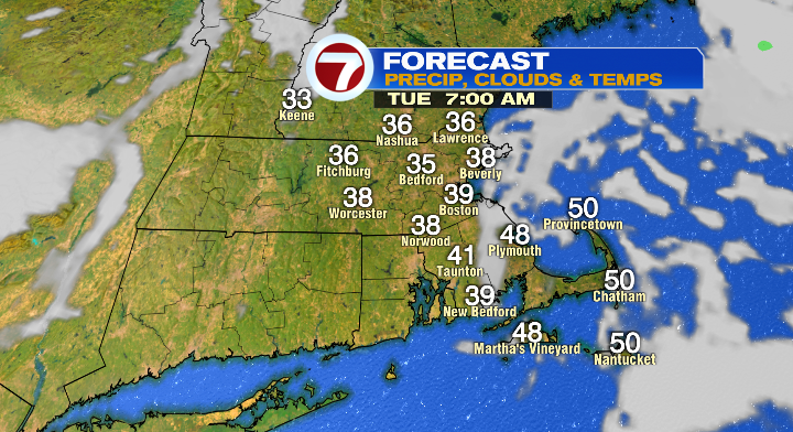 First, Tuesday is looking nice and partly sunny. It’ll be a cold start again in the mid to upper 30s. Highs will top off in the low 50s. We can’t rule out an isolated sprinkle or light shower across eastern Massachusetts, but that’s really about it. Overall, not a bad day.