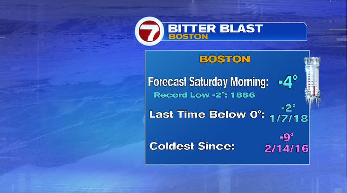 Here’s a closer look at the actual low temperatures Saturday morning. If the city of Boston falls to -4, this would be the coldest air since Valentine’s Day of 2016. Saturday, the afternoon high temperature for MetroWest will be near 15° with the wind making it feel like 0° to -10°. All around a very cold day!