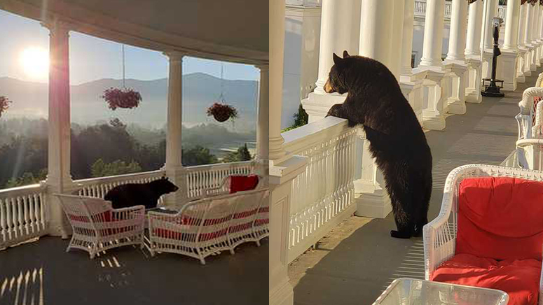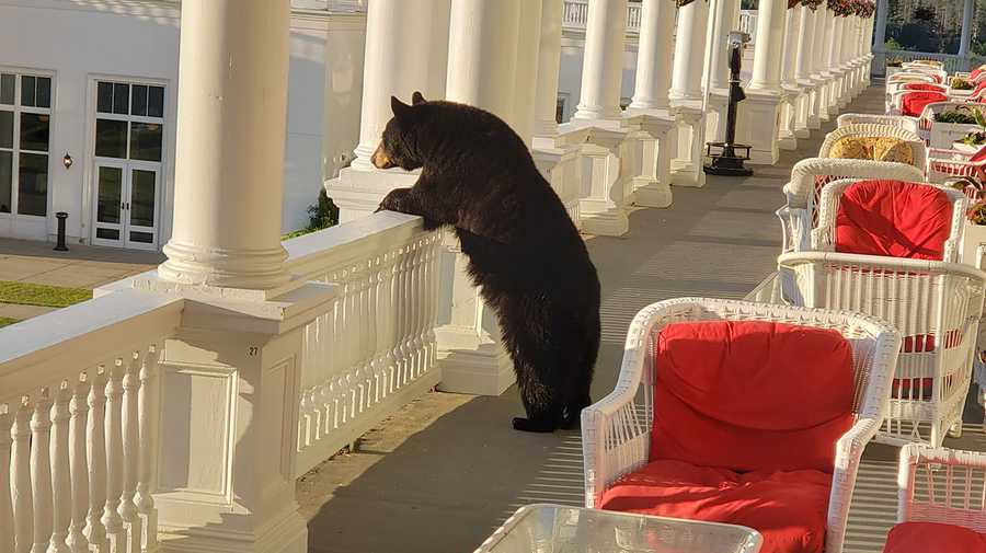 The bear was gazing off into the distance as it hung out on the hotel’s rear veranda before walking off.