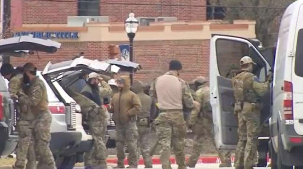 Video from Dallas TV station WFAA showed people running out a door of the synagogue, and then a man holding a gun opening the same door just seconds later before he turned around and closed it. Moments later, several rounds of gunfire could be heard, followed by the sound of an explosion.
