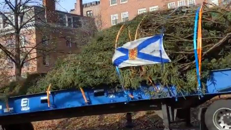 The tree — which departed from the Port of Halifax on Wednesday — arrived by police escort around 11 a.m.