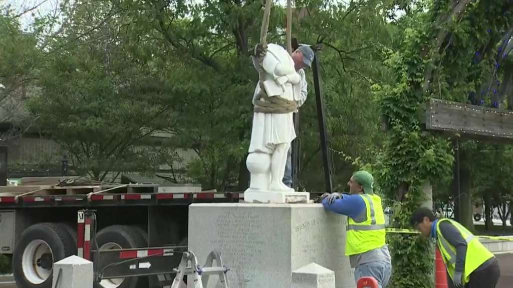 Crews used a large crane to remove the statue in downtown Chicago’s Grant Park from its pedestal. A small crowd cheered and passing cars honked as the statue came down about 3 a.m. The second statue was removed about 5:30 a.m. from Arrigo Park in Chicago’s Little Italy neighborhood.