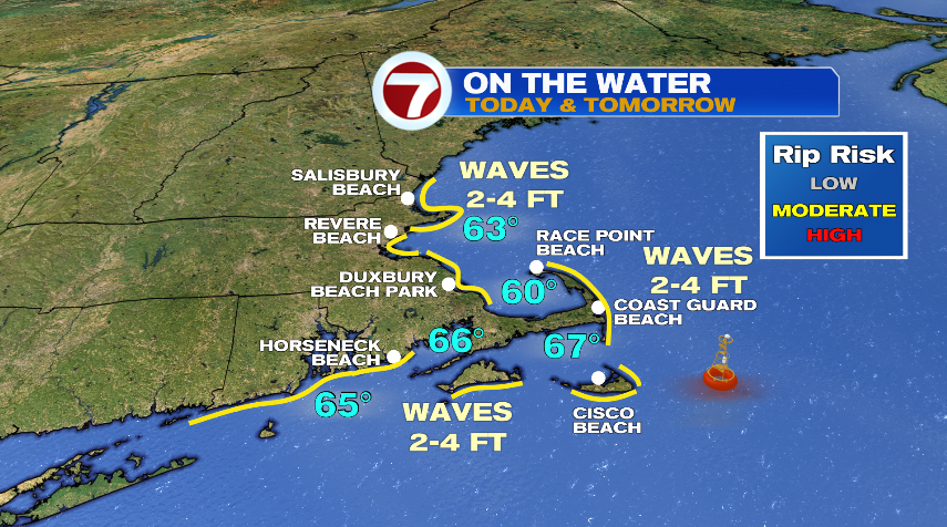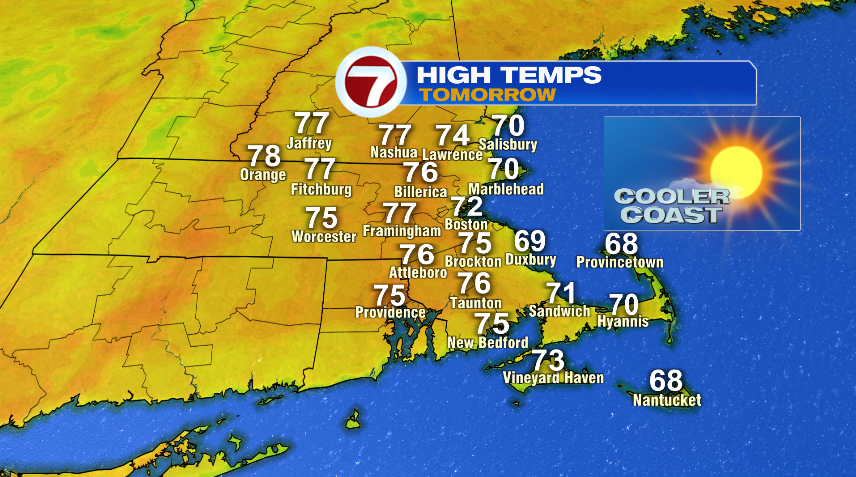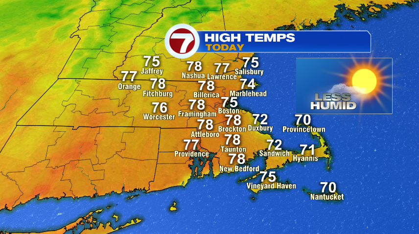 The rain from yesterday moved out overnight with the clouds and humidity following suit this morning. It’s a little sticky this morning with a few lingering clouds, but much of today will be less humid with the sun out in full force. Temperatures will head to the 70s everywhere, just slightly cooler on the coast — mainly on the Cape.