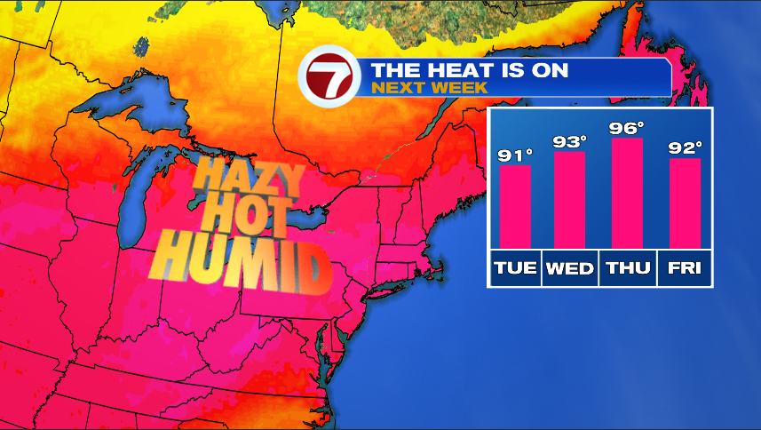 Then next week the heat is on! Monday is the transition day as the humidity starts to build and temperatures head to the 80s. From there it’s our first REAL heat of the summer with several days seeing temperatures in the 90s. Factor in the humidity and it will feel like it’s closer to 100° for most of next week.