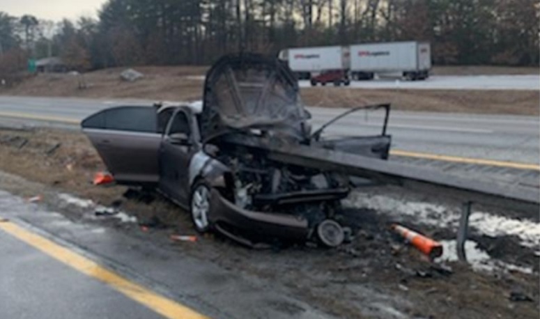 MERRIMACK, N.H. (WHDH) - A driver escaped serious injury after he crashed into a guardrail, leaving his car mangled in Merrimack, New Hampshire Friday morning.