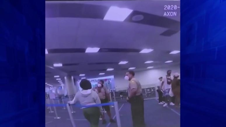 A bodycam video, posted on Twitter by South Florida filmmaker Billy Corben, shows the face mask-wearing Miami-Dade police officer speaking to the woman inside the terminal on Wednesday.
