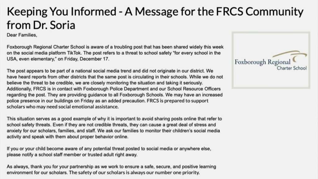The school’s website shows a letter about TikTok from Soria that warns of posts about school threats.