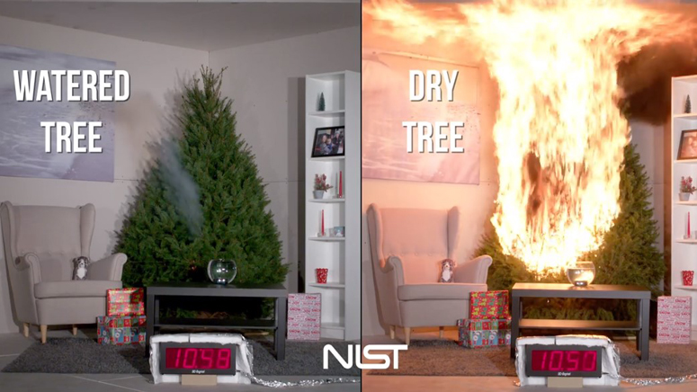 The National Institute of Standards and Technology (NFPA) shared a dramatic video, showing a side-by-side comparison of two trees on fire, one of which had been watered and one that is dry.