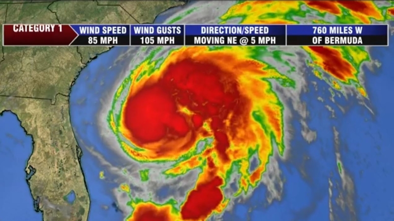 The storm had maximum sustained winds of at 110 mph (175 kph) Thursday, with tropical storm-force winds extending outward for 405 miles (650 kilometers), covering a huge swath of ocean. The storm was centered about 415 miles (665 kilometers) northeast of Bermuda and moving to the northeast at a brisk 24 mph (39 kph).