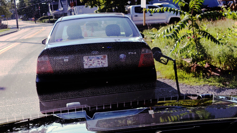 An officer stopped a black sedan, which had a pump nozzle in the gas tank and pump hose dragging on the ground.