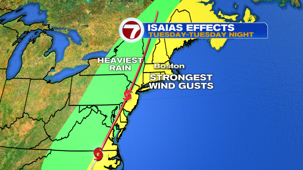 The main impacts with this storm will be the strong wind gusts since we are on the eastern side of Isaias’ projected path. Gusts could stretch into the 40-55 MPH range for a few hours this evening (starting around dinner time) and continue through at least sunset.