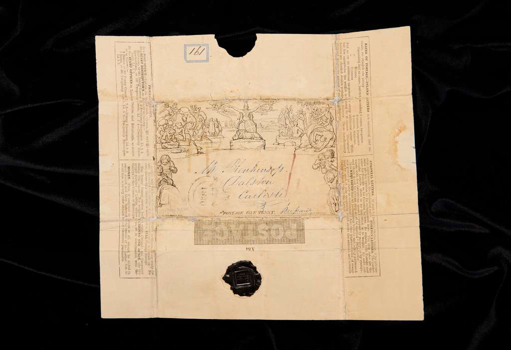 After receiving the letter, Blenkinsop Jr. turned the envelope inside out and refashioned it as a “Mulready” – an ornate wrapper embellished with images representing the British Empire that acted as another method of prepaid payment introduced at the same time as the Penny Black.