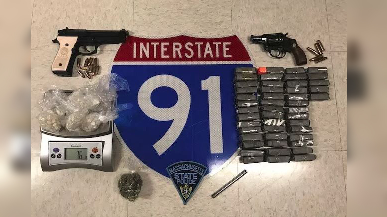 A trooper who stopped a 2004 Ford Focus on Interstate 91 northbound just before midnight arrested the occupants of the vehicle after allegedly finding 2,350 bags of heroin, 76 grams of crack cocaine, and two loaded firearms, according to state police.