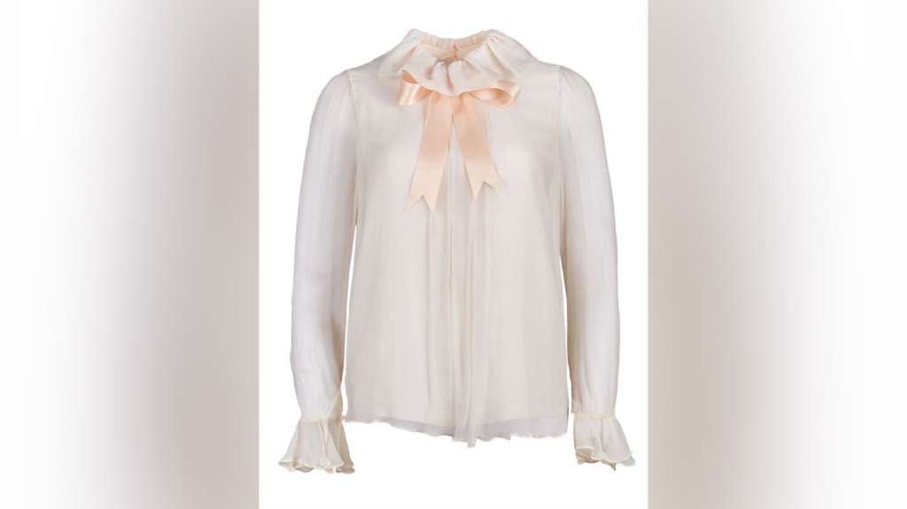 The blouse, which is complete with a satin ribbon tied in a bow underneath the collar, was designed by Elizabeth and David Emanuel, who famously went on to design Diana’s wedding dress.