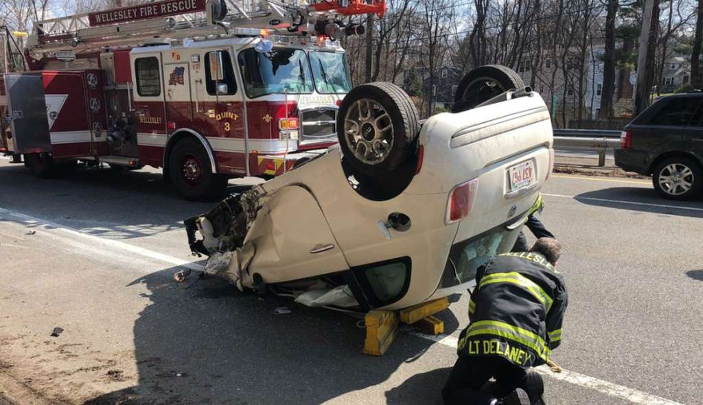 Emergency crews responding to a report of a crash on the westbound side of the highway before 2 p.m. found a two-door vehicle resting on its roof, according to the Wellesley Police Department.