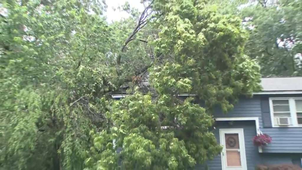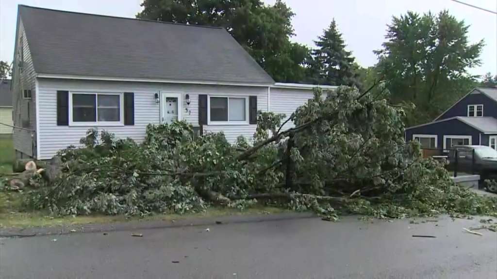 In Nashua, New Hampshire, the rain came down in buckets and a tree fell ontop of a roof.