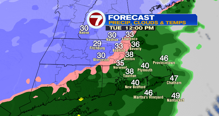 In the middle of the afternoon, the rain/snow/mix line will set up over the 495 corridor and right along the Mass Pike. So the farther south and east you are, the less snow and more rain you’ll see. However, west of the 495 corridor and north of the Mass Pike, snow and a mix will be falling.
