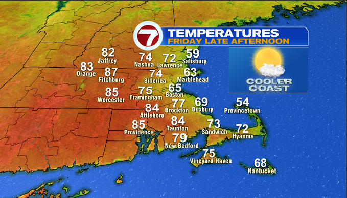 7Weather – Some towns joined the 90° club today! That includes you, Norwood and Fitchburg. High temperatures ranged in the 80s and 70s across most of our area. The summer-like temperatures continue inland tomorrow.