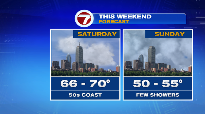 The weekend will feel and look a bit different. Temperatures will fall back day to day. Saturday starts with filtered sun and temperatures in the upper 40s/near 50°. We’ll see increasing clouds. Temperatures won’t be as warm inland as today and tomorrow. The coast will stay cooler in the 50s with an onshore breeze. Sunday starts off in the upper 40s/near 50°. Temperatures won’t budge much from morning to afternoon. We’ll see a lot of clouds with a chance for a few showers throughout the day.