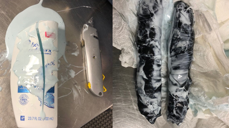 Photos shared by TSA New England showed two black packages of marijuana that were stashed inside a bottle of Head and Shoulders.