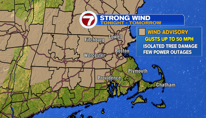 First, it’s all about the wind. The wind will crank up out of the northwest tonight as cold air works in. A Wind Advisory was expanded to most of our region, outside of Plymouth County, the Cape and Islands. This runs tonight through tomorrow. Gusts between 40 and 50 mph could cause isolated tree damage and lead to a few power outages.