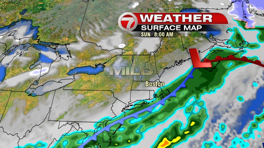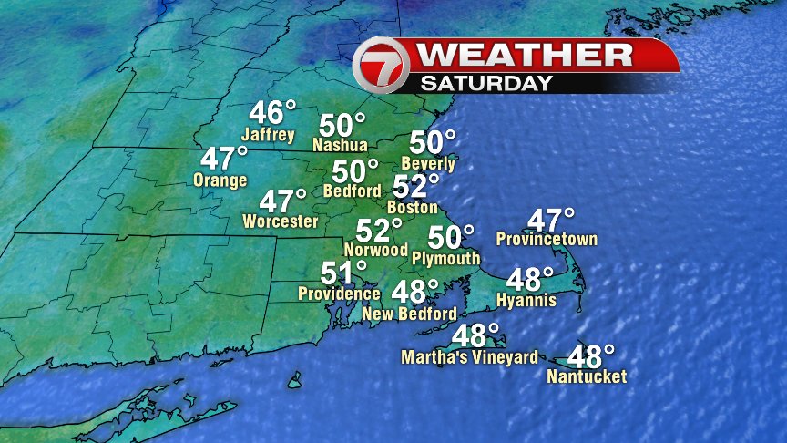 Showers roll in here between midnight tonight and 9am Sunday. By 9am, most of the area dries out, but light showers and sprinkles likely linger through midday across Southeast Mass, especially down near Buzzards Bay and the Cape and Islands. It’ll still be mild, near 50.