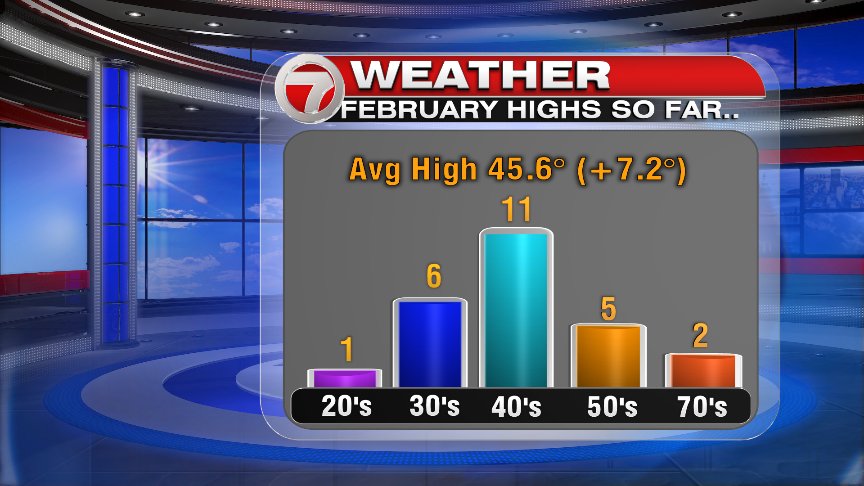 It’s also looking like it will be an above average wrap to the month. If you’ve been keeping track, you already know it’s been a warm February. No days this month had highs in the 60s, but the 40s, 50s and 70s ruled this month: