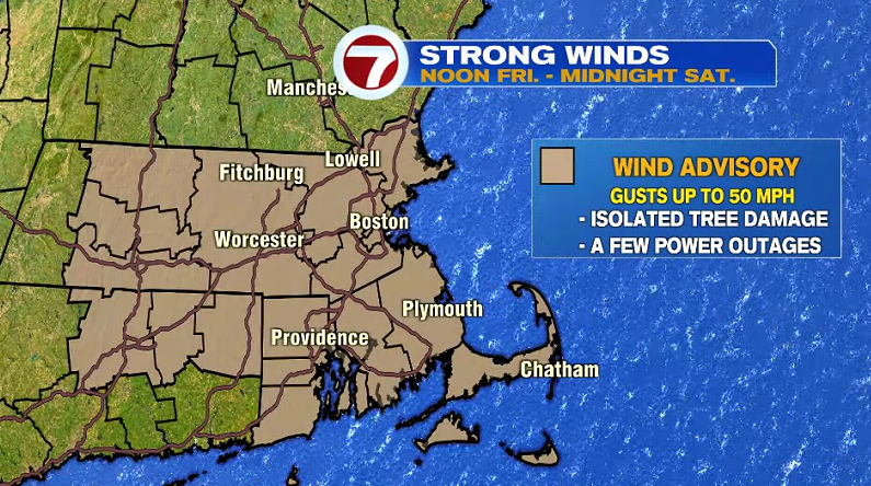 With gusts that high, a Wind Advisory has been issued for much of Massachusetts from noon tomorrow through midnight. Isolated tree damage and a few power outages are possible.