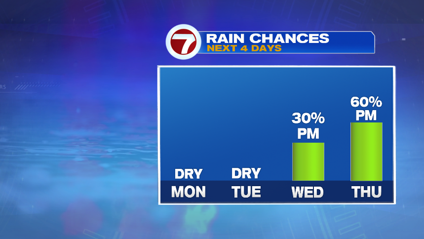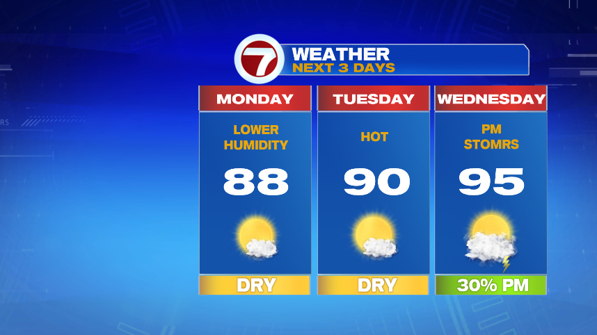Monday is warm with temps in the mid and upper 80s. A front cleared the region on Sunday, keeping our humidity low to start the week.