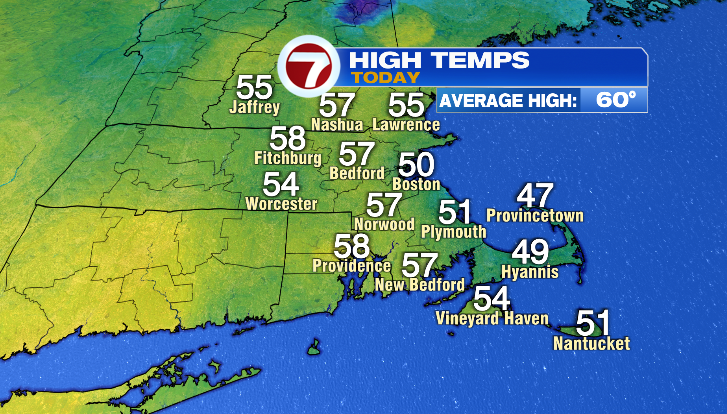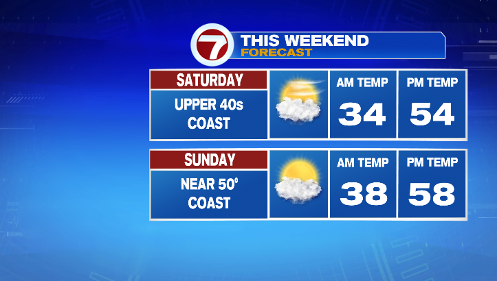 With that area of low pressure moving south of us, through the Mid-Atlantic states, we will see some high clouds filtering in on Saturday. Otherwise, temperatures will remain cool, with the coast in the upper 40s and inland areas in the low 50s.