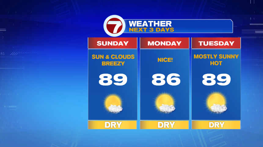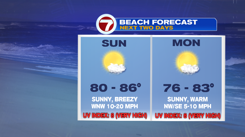 We add on another hot day on Sunday. The next two days are great beach days. Sunday will be slightly warmer, but it will also be breezy at times. Winds calm down a bit on Monday, and there will be plenty of sunshine.