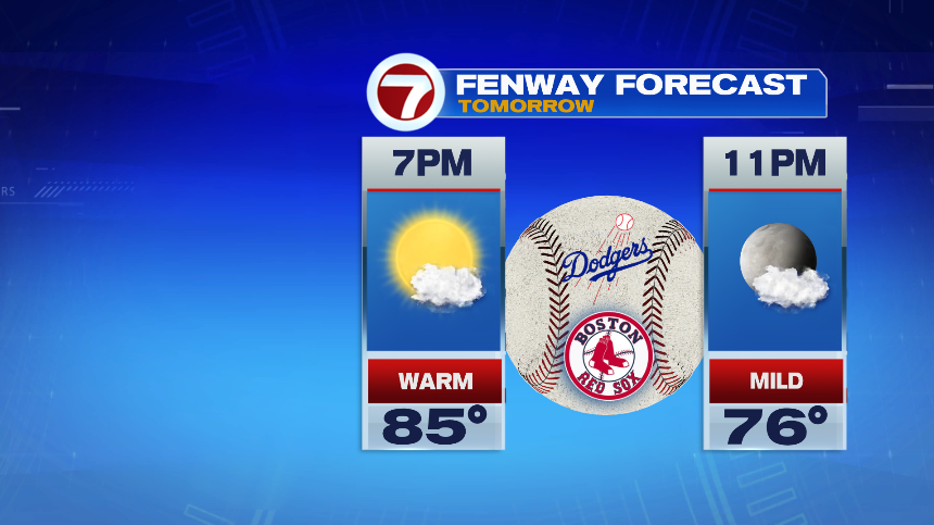 Heading to the Red Sox game on Sunday? We’re looking at a great evening at Fenway! It will be warm to start the game with temps in the mid 80s at first pitch. Once the sun goes down, we gradually drop into the 70s. It will be dry and mild to end the game. Go Sox!