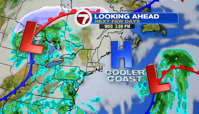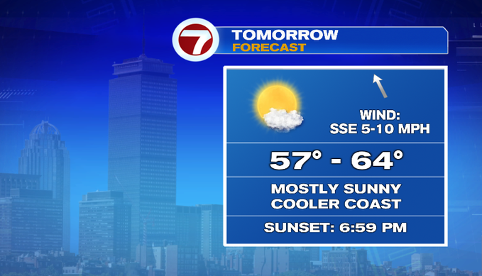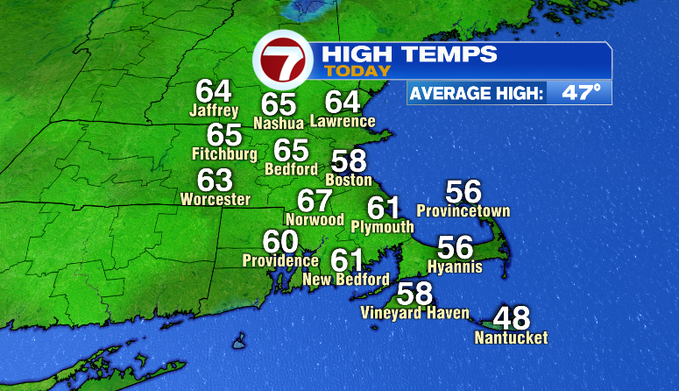 Thursday will be mostly cloudy as a system approaches from our southwest. That system could bring a few showers late Thursday night, but the bulk of the rain holds off until Friday. Highs on Thursday will be warmer in the upper 60s inland, cooler for the South Coast and the Cape due to the southwesterly wind.