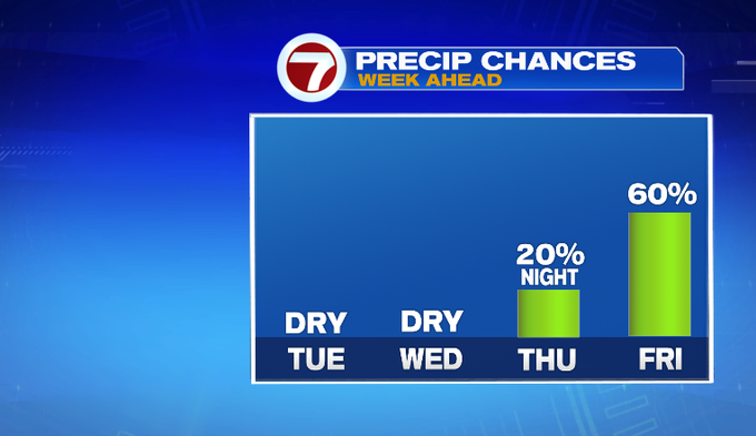 A few showers late morning Friday into the early afternoon, but it won’t be a complete washout, but we certainly do need the rain. This will be at least some relief for allergy sufferers after the pollen count climbs with the warm weather and dry conditions through midweek.