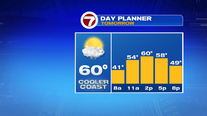 Temperatures start in the 30s very early Tuesday morning, and then we jump into the low 60s in the afternoon. The day starts sunny and then clouds gradually move in throughout the afternoon. There could be a light southeast wind that kicks in, keeping the coast a bit cooler at times throughout the day.