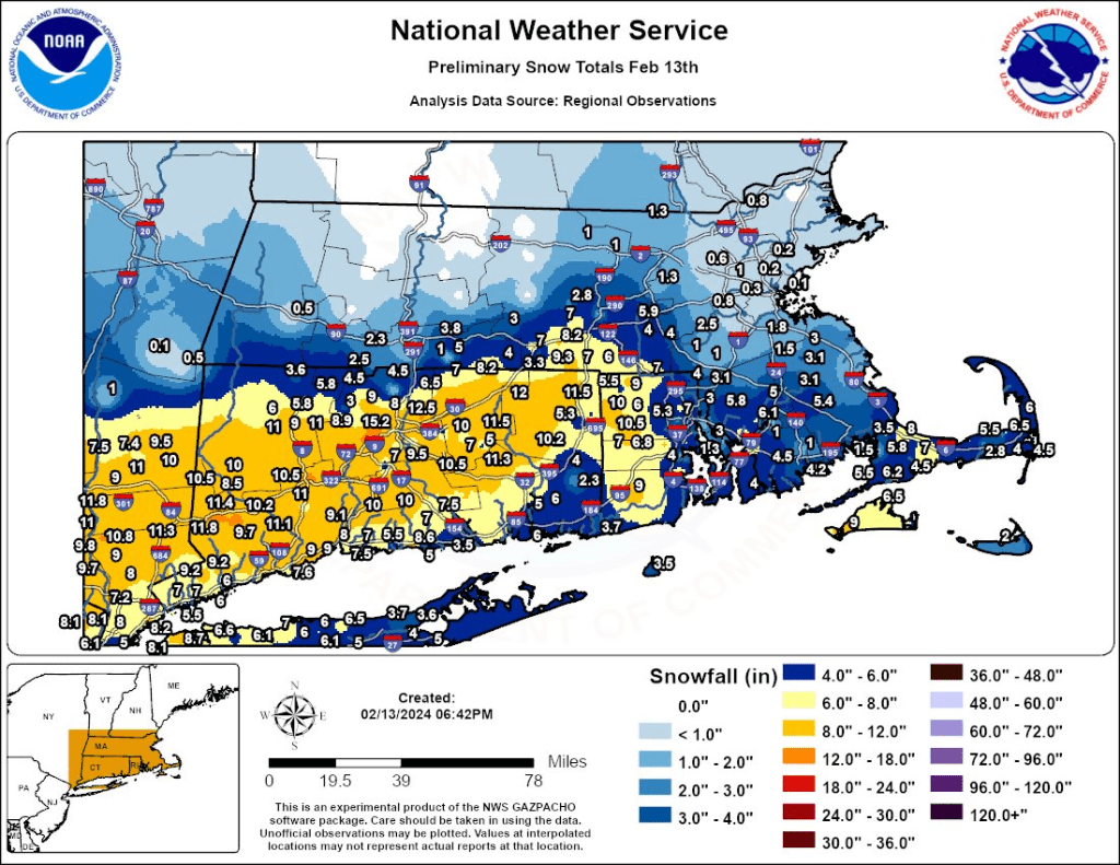 As everything came together about 30-40miles farther south than it appeared it would Sunday night/early Monday, the axis of heavy snow shifted out of most of Massachusetts and back into CT, RI and Southeast Mass. Below are some of the snow totals across the region. You can see a bunch of 4-8″ totals across far Southeast Mass, 5-10″ in much of Rhode Island and 8-15″ in a large chunk of CT.