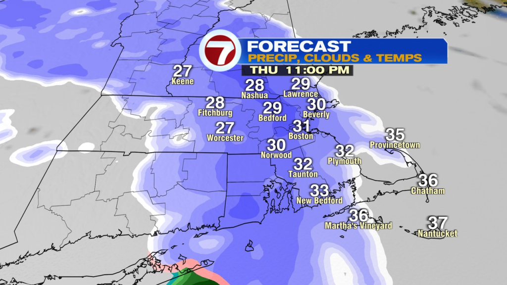 Tomorrow is dry during the day with increasing clouds in the late afternoon. Clouds advance in late in the day as some snow slides in during the evening hours. A burst of light to moderate snow drops a couple hours either side of midnight, dropping a coating to a couple inches for most.