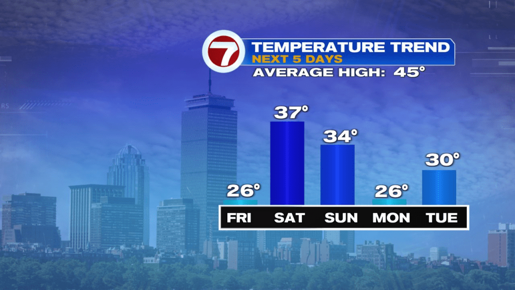 The recovery today is modest with highs back into the mid to upper 20s this afternoon, 15-20 degrees below average for the time of year. At least winds will be light as the northwest breeze drops off to about 5mph.