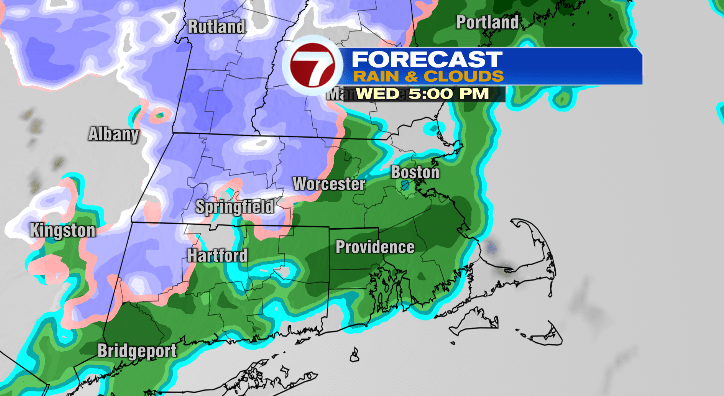 Wednesday we warm up! We’ll only be in the 20s in the morning. The afternoon temperatures vary greatly. Near Boston and areas south and east we’ll be very mild in the mid to upper 40s. In the Worcester hills, highs will top off in the mid to upper 30s. That’s why we’re looking at rain for most in the afternoon and evening, but a chance for some snow or a mix in the Worcester hills where some spotty coatings are possible.