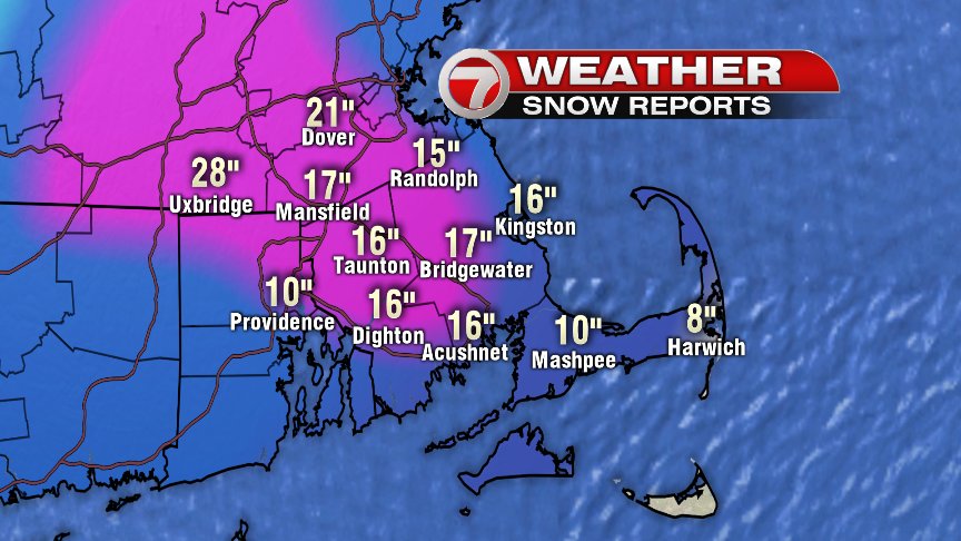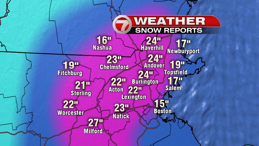 Wow! That band of snow that came through MetroWest and eventually hit the coast was impressive yesterday afternoon/early evening hours. With snowfall rates of 4″/hr, it only took a 2-3hr period of heavy snow for many towns to jump from 1 foot of snow to nearly 2 feet! The list of towns over 20″ goes on and on and on, leaving plenty of cleaning up to be had this Wednesday morning.