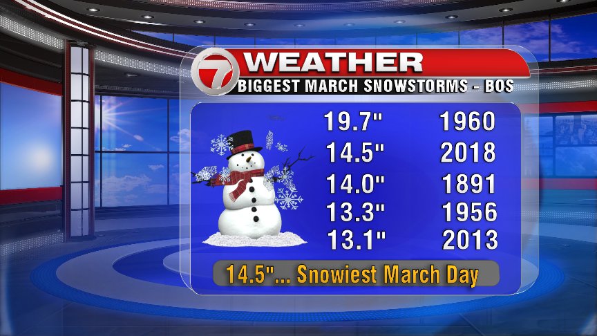 In Boston, the 14.5″ that fell was good enough to break the daily, March 13th, snow record set in the 1993 Superstorm and fall into 2nd place for the biggest March snowstorm on record. The only late season storm that was greater, was that April Fool’s Blizzard of 1997. Yes, this was a blizzard too.
