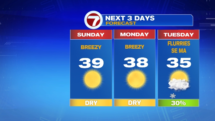 Sunday’s forecast will feature mostly sunny skies and temps in the 30s. Expect a similar forecast on Monday.