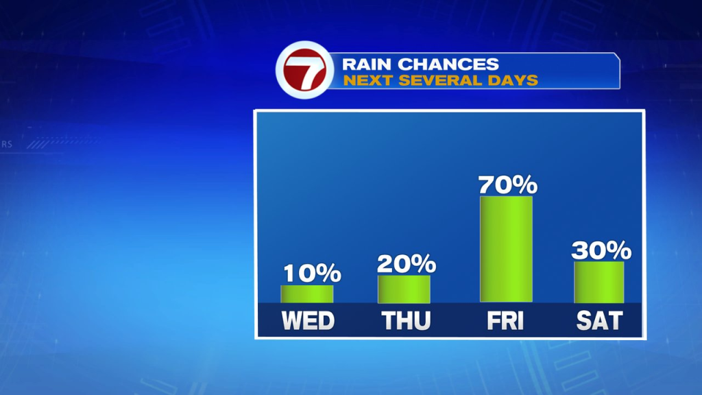 Showers and storms are likely more widespread again Friday with highs in the low 80s and dew points running past 70 as high humidity surges in.