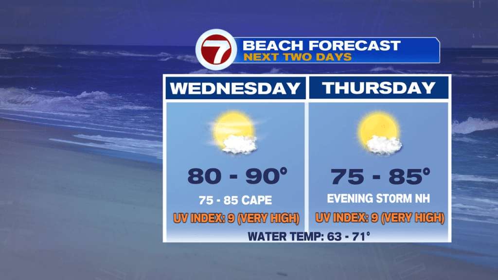 Today, while we step up the temps another notch, we’ll also notch in another beach/pool day across the region. Temps are set to soar into the upper 80s to lower 90s as more hazy sunshine wins out. While there is the risk of a late-day storm northwest, near and outside 495, much of the day is rain-free.