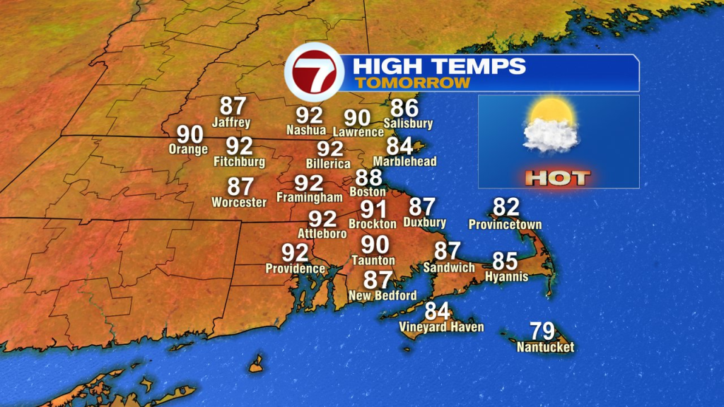 Tomorrow, temps will be similar, just a couple degrees cooler, but also more humid with the chance for a few isolated storms northwest of Boston in the afternoon.