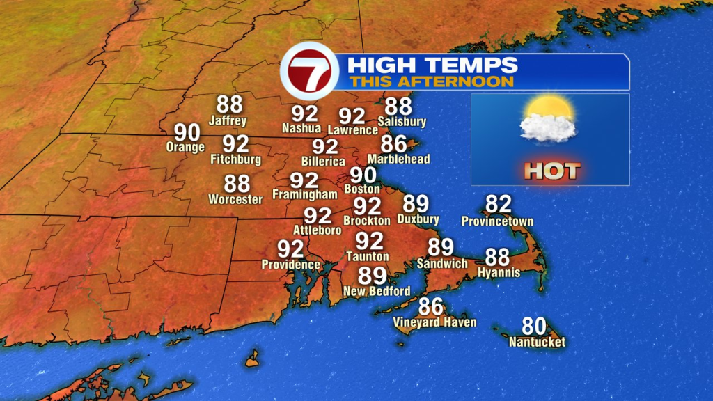 Will Boston hit 90 today for the first time this year? Whew… it’ll be close. The west wind isn’t overly strong, so it’s possible a sea breeze caps temps in the upper 80s at Logan Airport, where the official city temps in taken. With that said, Downtown Boston, Back Bay, Fenway, and other areas of the city that’s not on the water’s edge will likely push into the lower 90s. Low 90s will be common across much of eastern Mass. Even Cape Cod runs mid to upper 80s this afternoon.