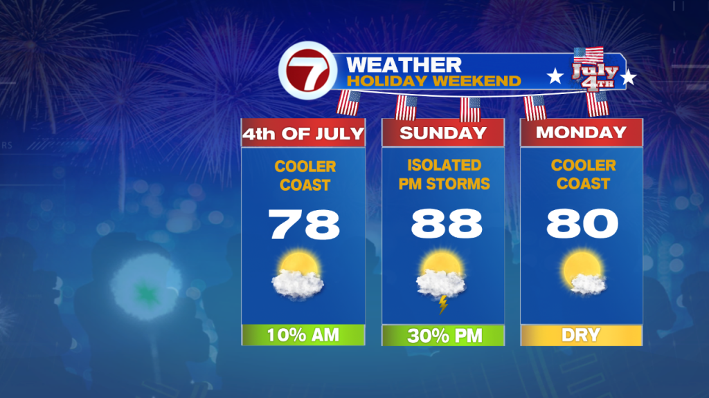 The Fourth starts off with clouds, then we’ll see the sunny breaks by midday, allowing temperatures to warm up into the low 80s inland, around 70 at the coast (onshore breeze keeps temperatures slightly cooler).