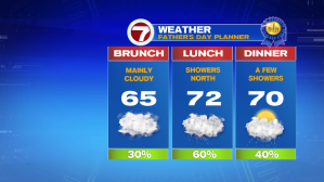 By dinner time, a few lingering showers are possible, otherwise drier conditions are expected, but the clouds stick around. High temperatures Sunday will only stretch to around 70°.
